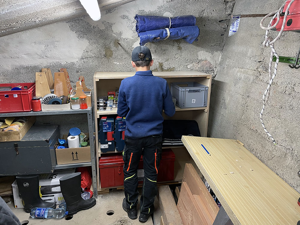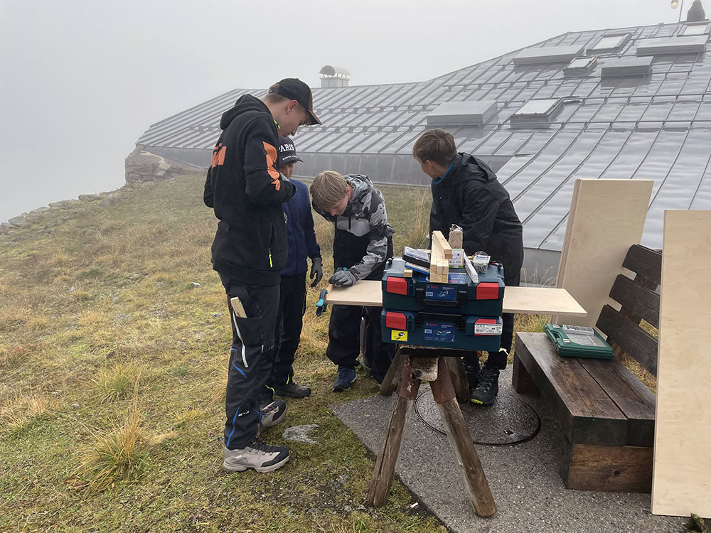 Der Dienstag stand ganz im Zeichen praktischer Arbeit. In enger Zusammenarbeit mit dem Hüttenwirt Tim Härter und dem Team des DAV Tübingen fertigten die Jugendlichen stabile Holzregale, die künftig im Hüttenbetrieb zum Einsatz kommen. Zusätzlich entstand eine praktische Handybox, in der Gäste ihre Mobiltelefone ordentlich und sicher ablegen können. Neben handwerklichem Geschick war hier Teamarbeit gefragt – vom genauen Messen und Sägen über das Schleifen bis hin zum gemeinsamen Montieren. Am Abend konnte die Gruppe stolz auf die sichtbaren Ergebnisse des ersten Arbeitstages blicken.