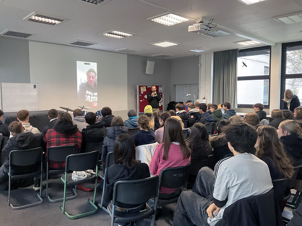 Zwei Fragen standen in diesen 90 Minuten im Zentrum: "Wofür lohnt es sich zu leben?“ und „Was macht dich wertvoll?" Sehr schülernah und authentisch kam er dazu mit den Schülerinnen und Schülern ins Gespräch und berichtete von seinen Erfahrungen im Profisport und wie er in herausfordernden Momenten und bei schwierigen Entscheidungen Halt in seinem Glauben fand. Passend zu den für die 10er anstehenden Prüfungen, ging es auch um den Umgang mit Leistungsdruck und Themen wie „Erfolg haben“ und „Scheitern“.