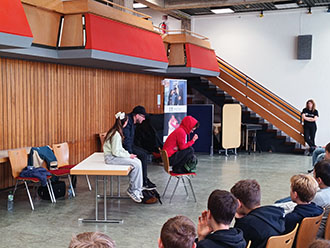 Um 08.45 Uhr begann das interaktive Theaterstück #disslike. Die drei Theaterpädagogen aus der Ortenau spielten eine Szene, wie sie täglich wohl hundertfach vorkommt: Aus Wut wird ein Foto einer Mitschülerin mit einer App bearbeitet und dann viral verbreitet- mit dem Ziel, diese Person öffentlich lächerlich zu machen. Mit offenem Ausgang für das Opfer. Die Schüler wurden immer wieder in das Theaterstück mit einbezogen, gemeinsam wurden Szenen weitergespielt und die einzelnen Situationen mit den Kindern evaluiert.
