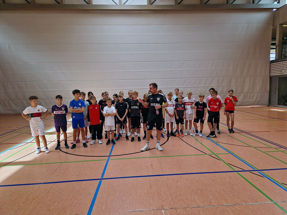 Gleich zwei sportliche Höhepunkte durfte die Jerg-Ratgeb Realschule in der vergangenen Woche erleben. Am Dienstag, den 17. September, war die VfB-Fußballschule zu Gast und sorgte für Begeisterung bei den Sportklassen 7c und 8c. Die Schülerinnen und Schüler kamen in den Genuss einer professionellen Trainingseinheit, bei der nicht nur Technik, Koordination und Teamgeist gefragt waren, sondern auch jede Menge Spaß im Vordergrund stand.